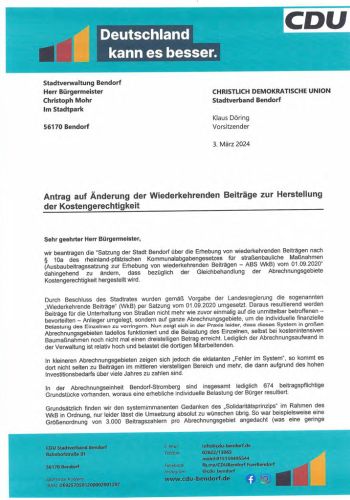 Antrag auf Änderung der Wiederkehrenden Beiträge zur Herstellung der Kostengerechtigkeit