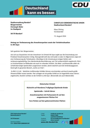 Antrag zur Verbesserung des Anwohnerparken sowie der Verkehrssituation In Alt-Sayn