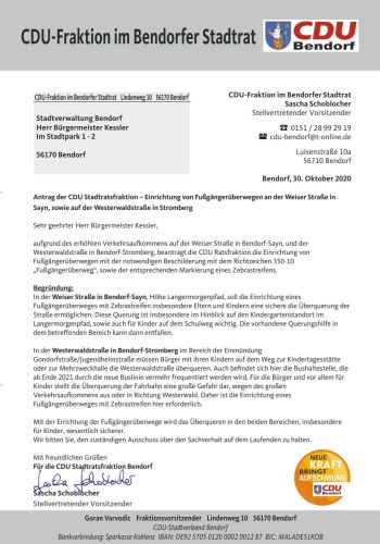 Antrag der CDU Stadtratsfraktion – Einrichtung von Fußgängerüberwegen an der Weiser Straße und Sayn, sowie auf der Westerwaldstraße in Stromberg
